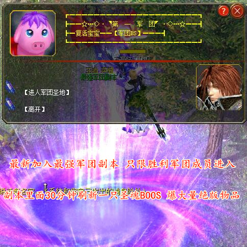 【最新开发独家军团争霸赛】:每小时15分-30分可以免费自由进入参加,里面设置5根军团战柱。每小时16分开始占领,每小时30分截止免费自由进入。30分-45分占领失败的军团可以从NPC缴纳10亿魔石进入继续挑战。50分-55分为领奖时间!哪方军团把5根柱子全部占领,军团长可领取一个大礼包,里面包含 圣魂超级宝宝1个+5亿积分礼包!